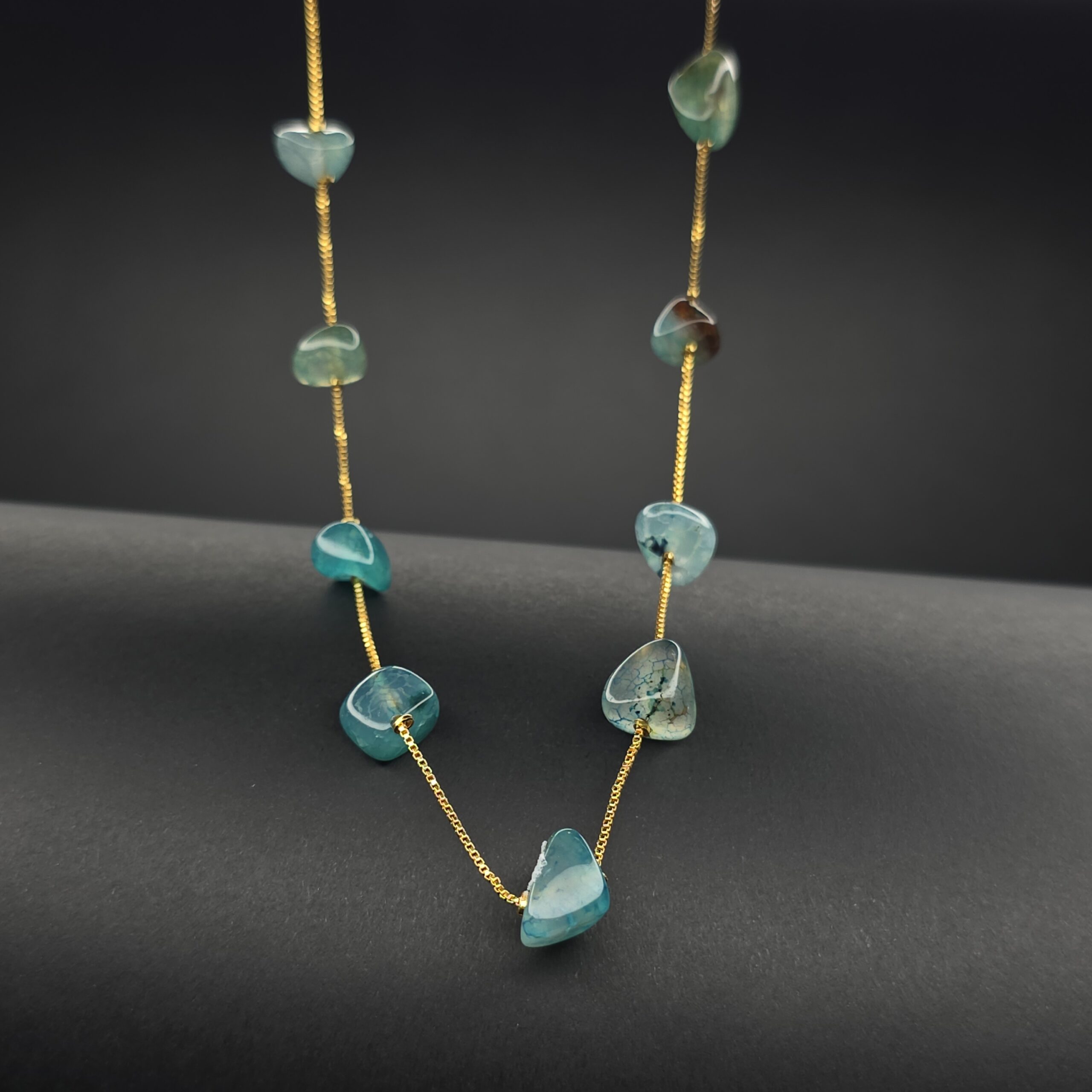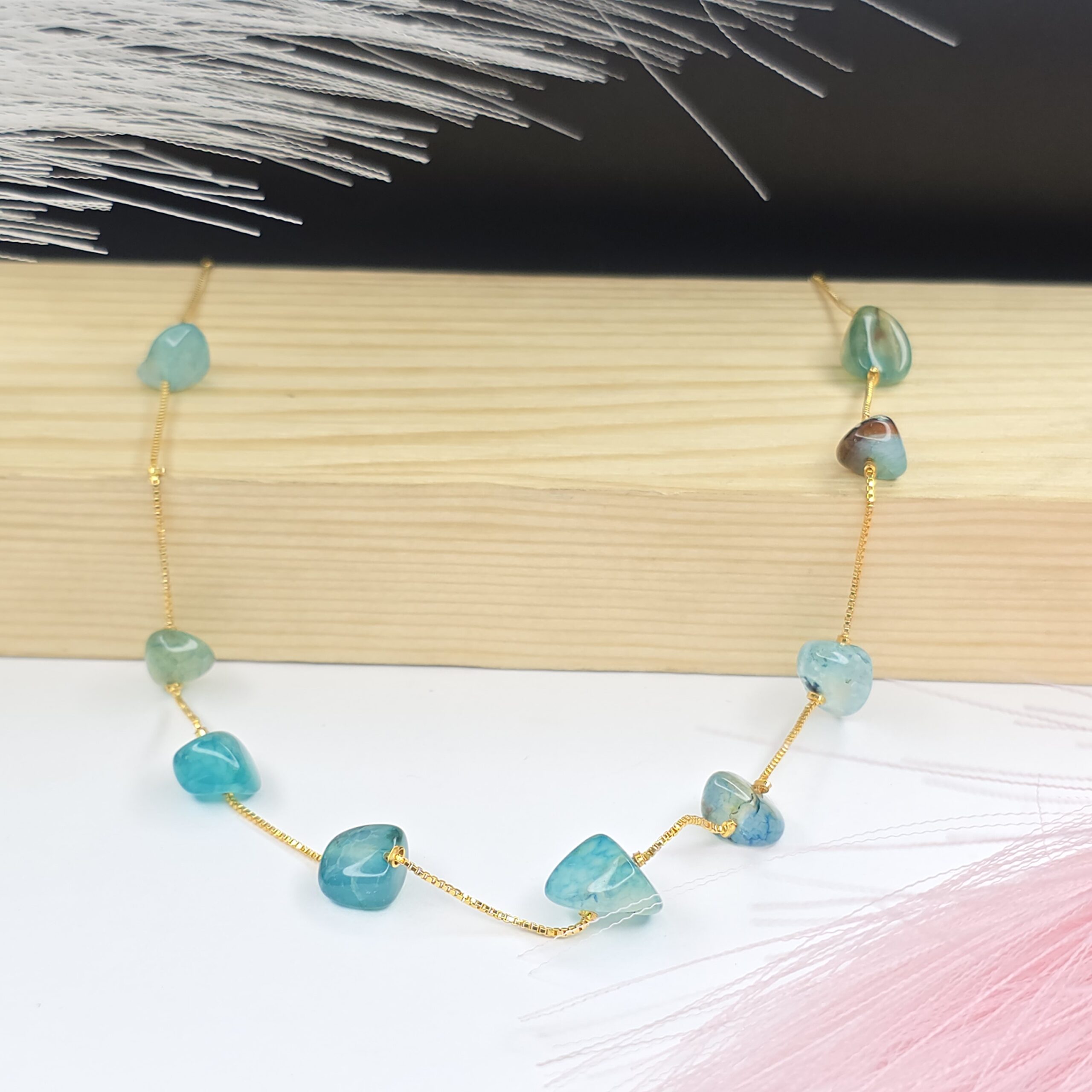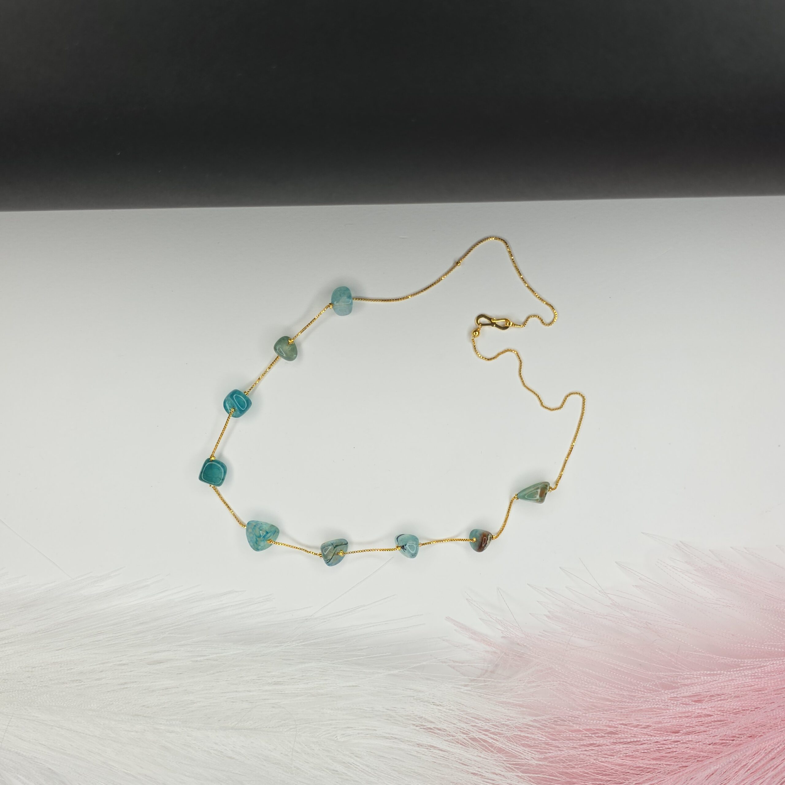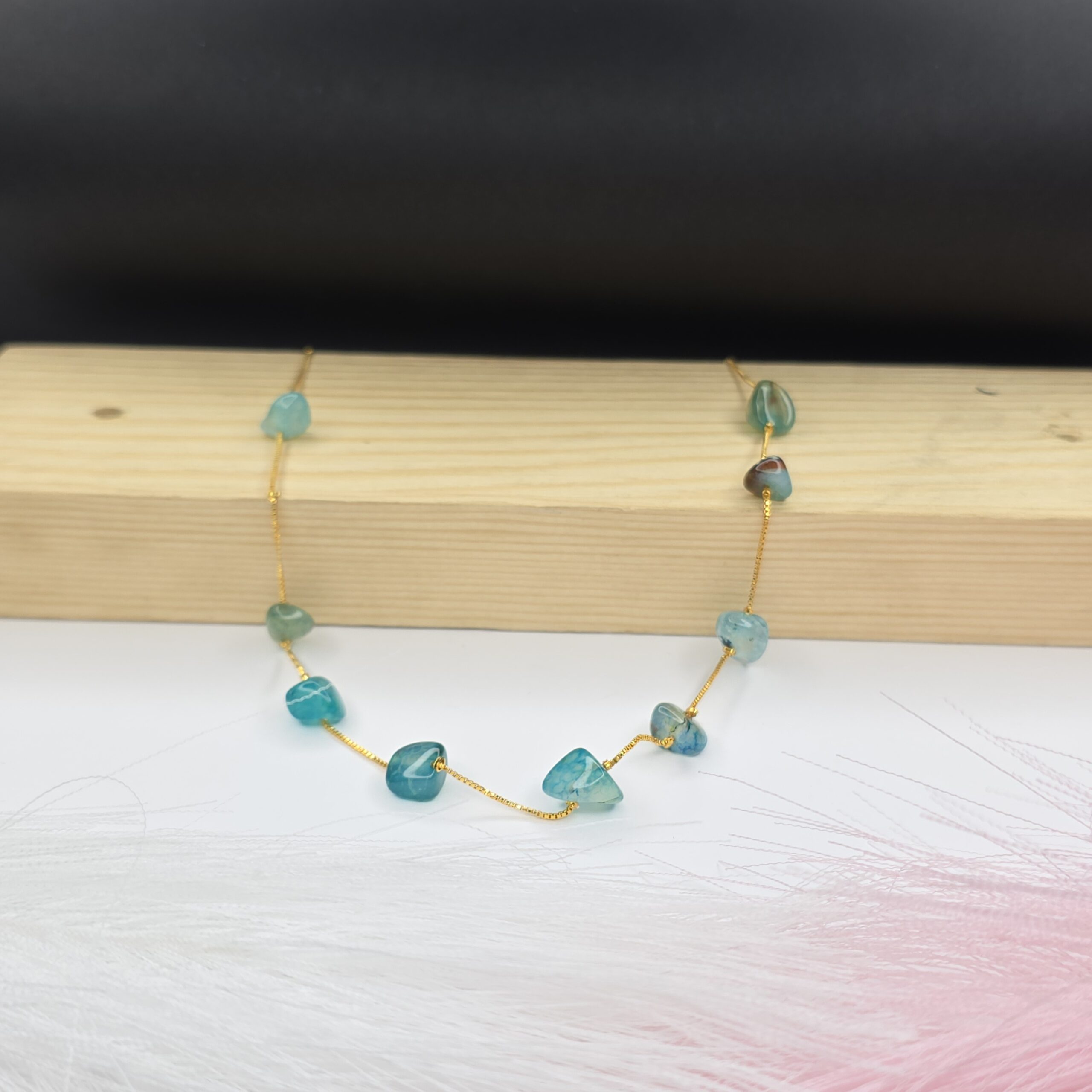 Add effortless elegance to your style with the Prism Aura Necklace, crafted with handpicked multicolor gemstones delicately placed along a fine gold-toned chain. The soothing blend of blue and aqua hues creates a fresh, graceful look that complements both casual and festive outfits.