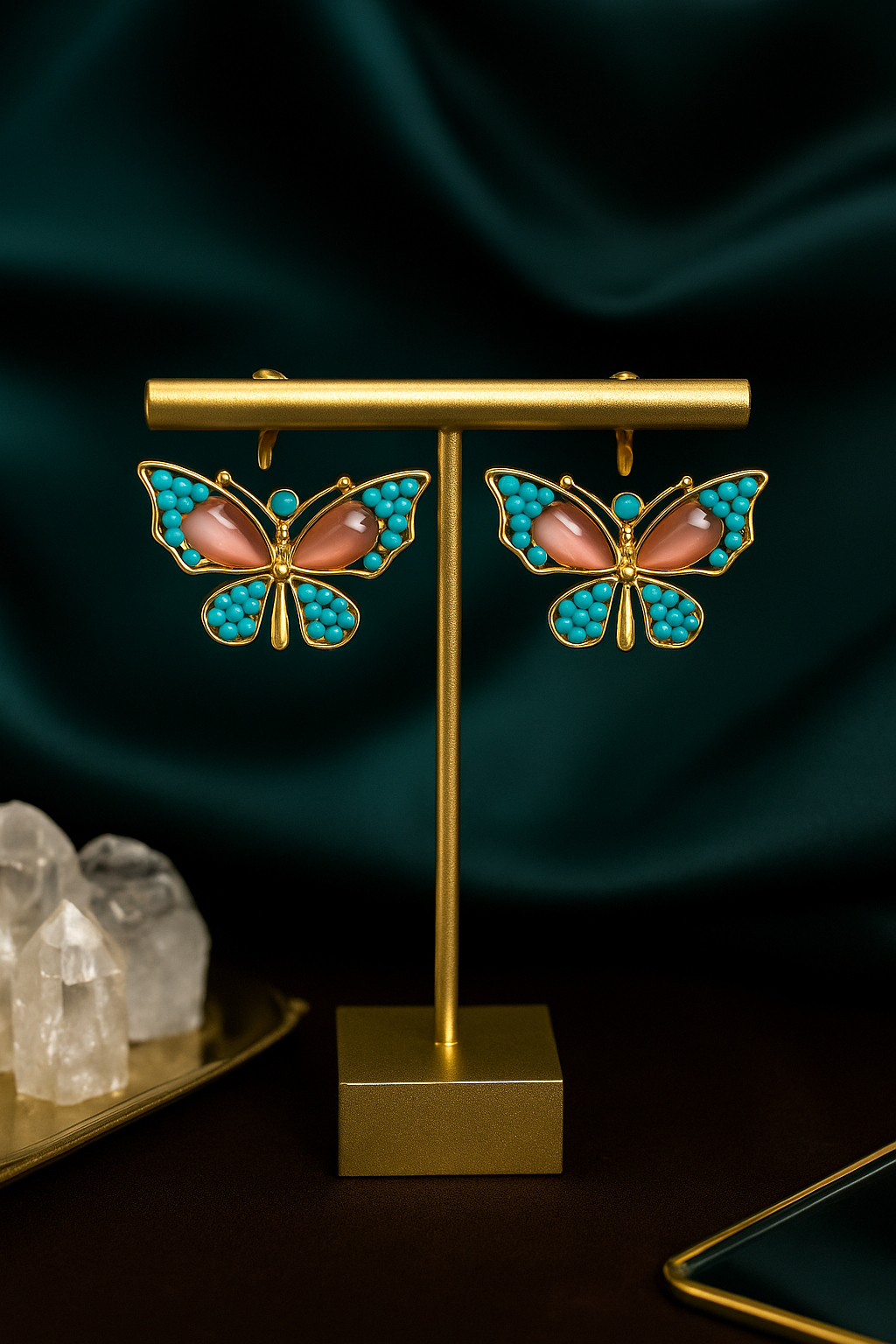 Azure Butterfly Spark Studs are inspired by freedom, beauty, and effortless elegance. Designed in a graceful butterfly shape, these studs feature vibrant turquoise-toned detailing paired with soft blush accents and a refined gold finish. Lightweight and eye-catching, they add a playful yet classy charm to your look. Perfect for daily wear, brunch dates, or festive styling, these earrings bring a pop of color and a touch of joy to every outfit.