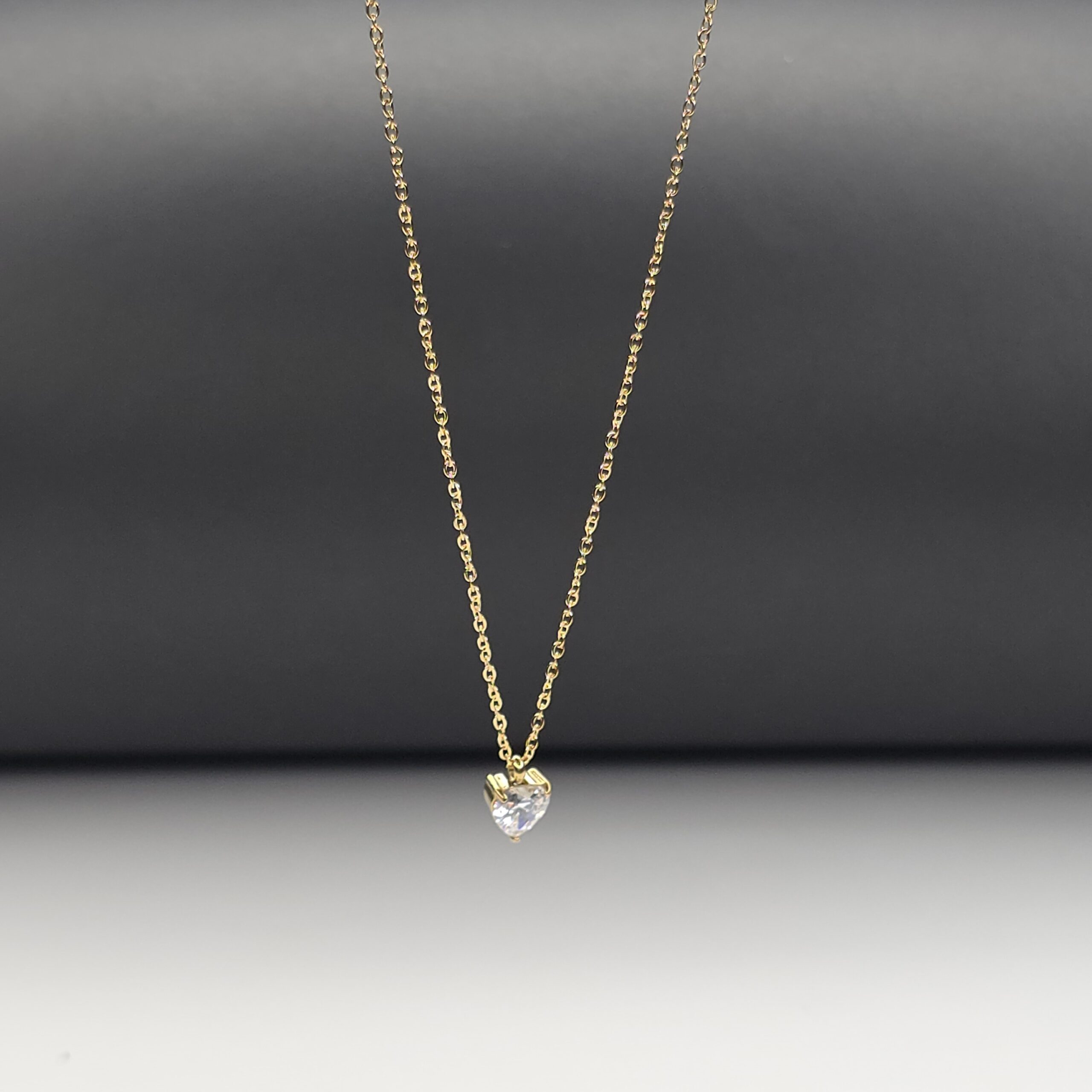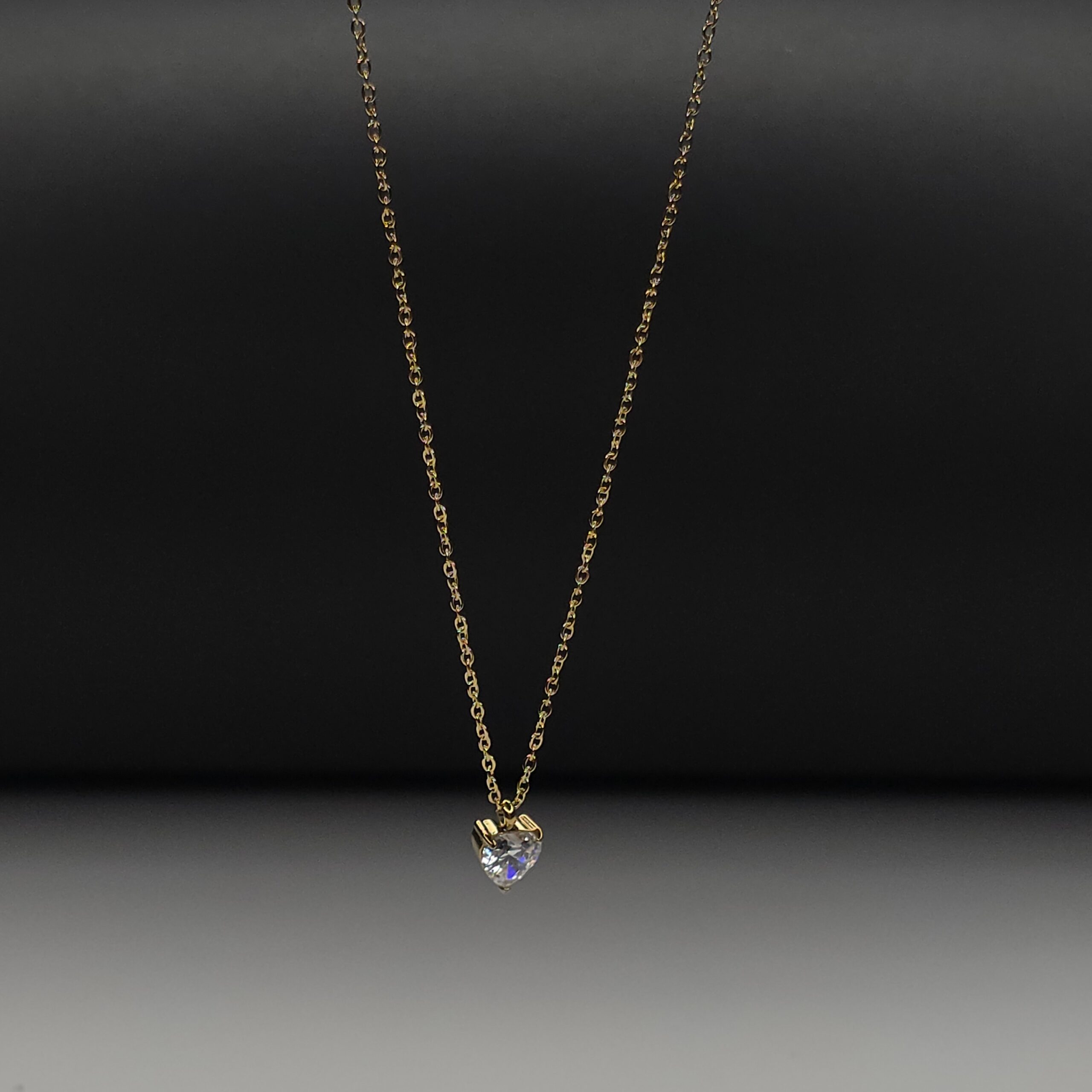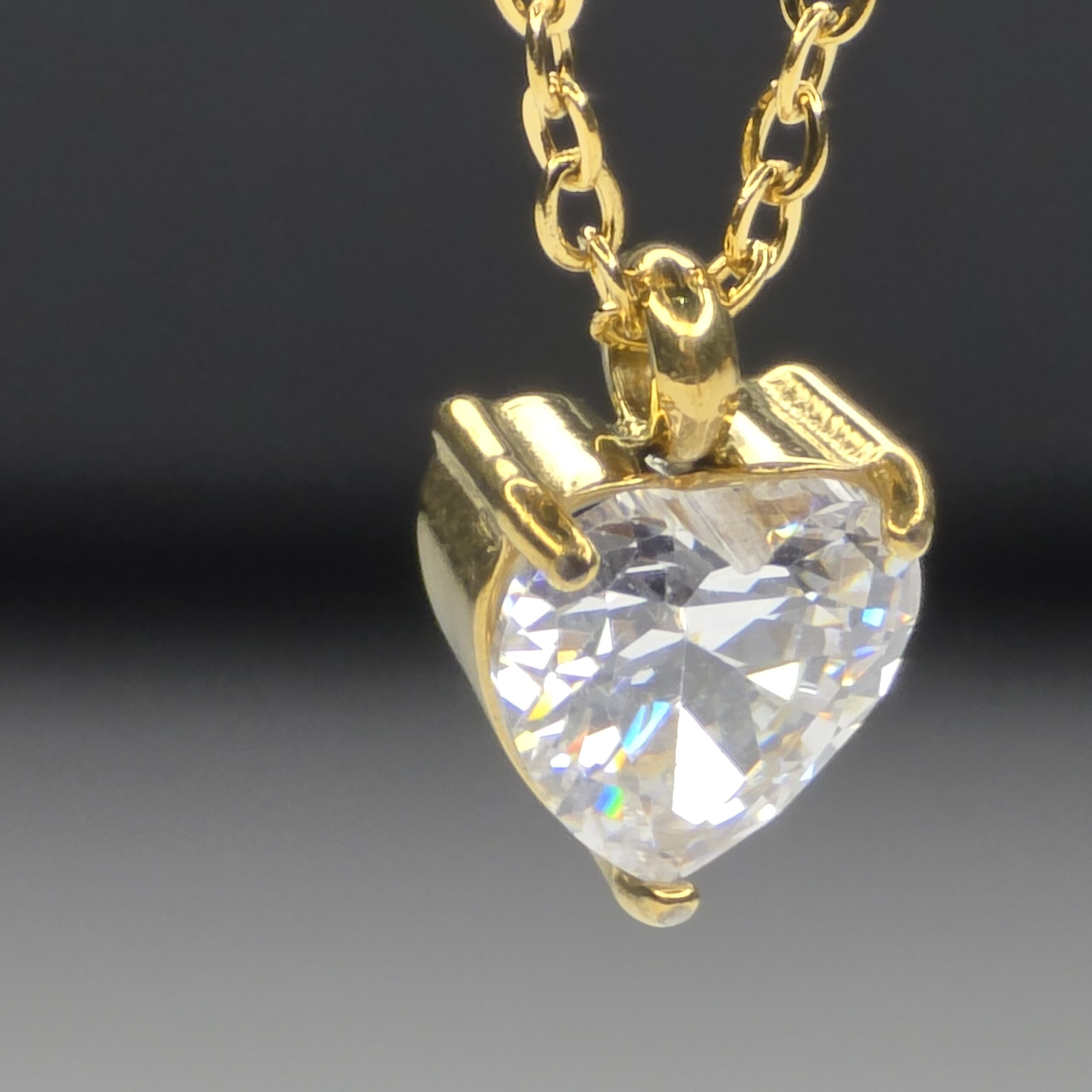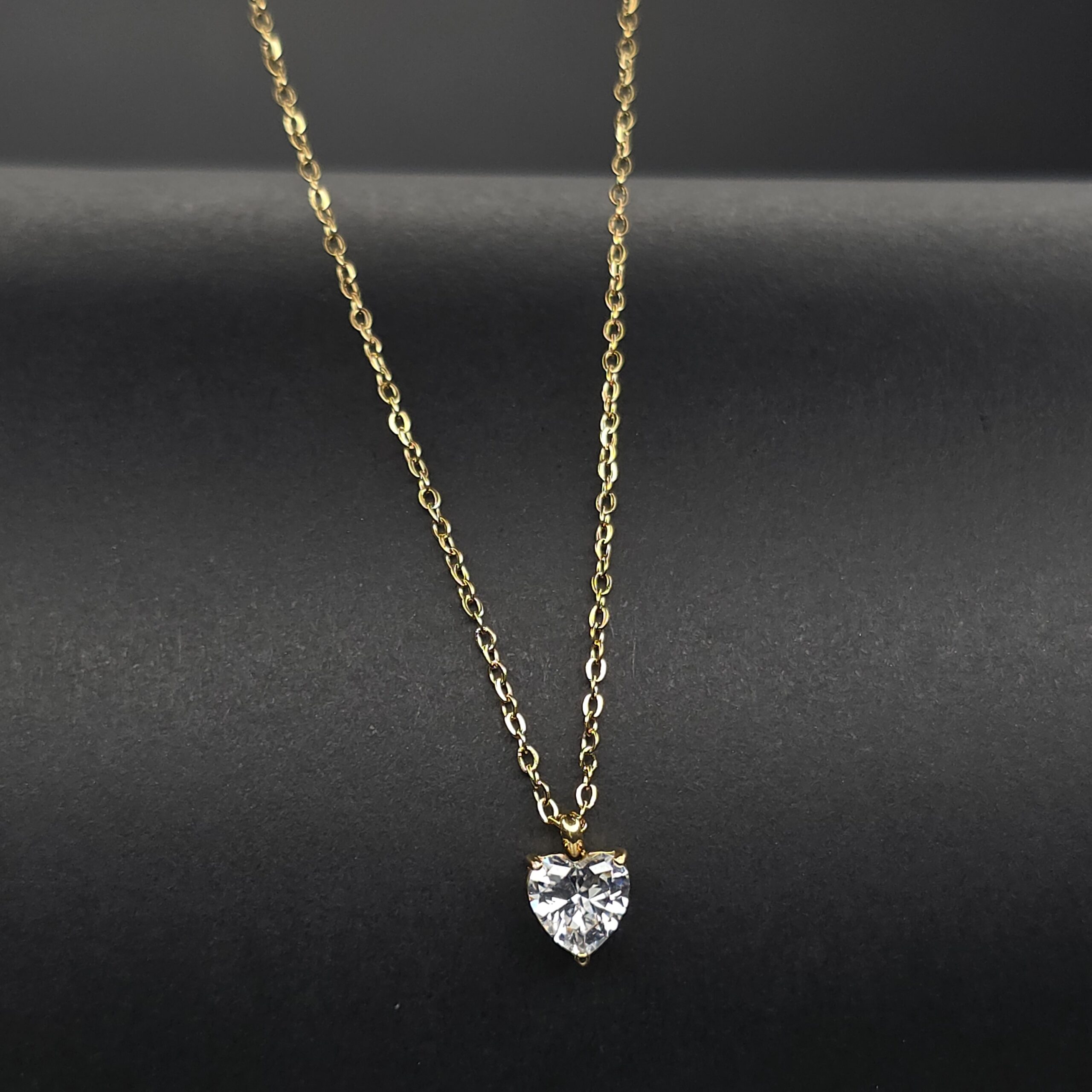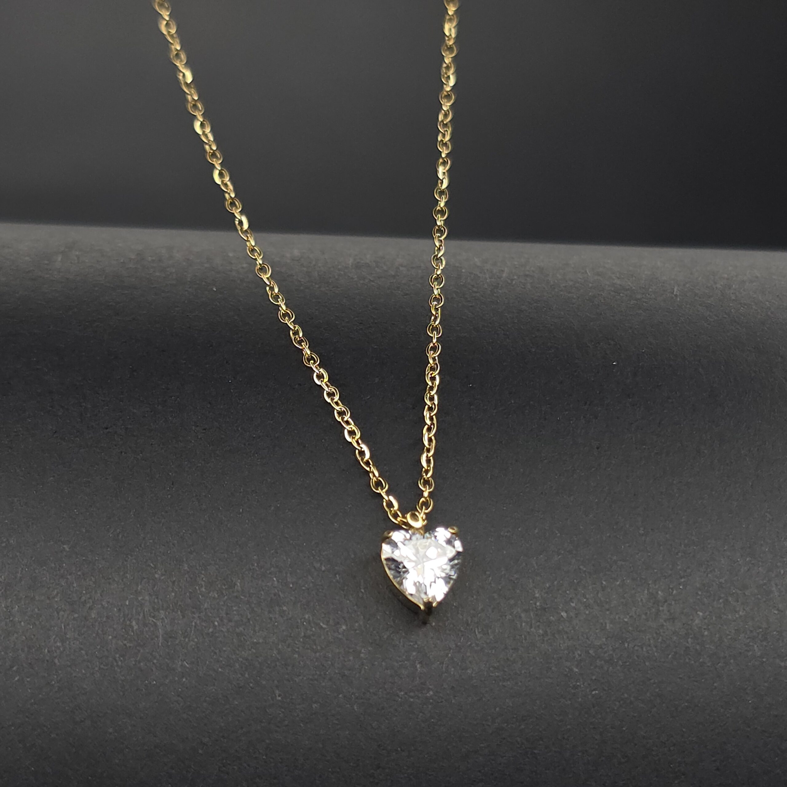 A beautifully crafted heart-shaped crystal pendant set in a radiant gold finish, paired with a delicate gold chain. The sparkling clear stone reflects light effortlessly, making it perfect for everyday elegance or special occasions.
