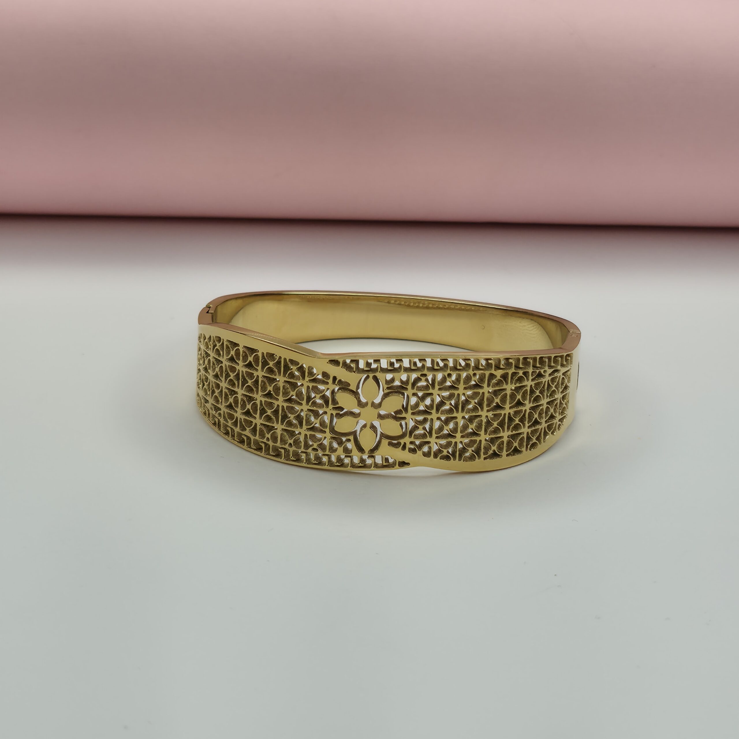 The Golden Bloom Lattice Bracelet is a celebration of symmetry and soul—where delicate geometry meets floral grace in a polished gold embrace. Its openwork lattice design flows like woven light, anchored by a central bloom that radiates quiet strength. Each curve and contour reflects artisanal precision, creating a piece that feels both timeless and tender.
