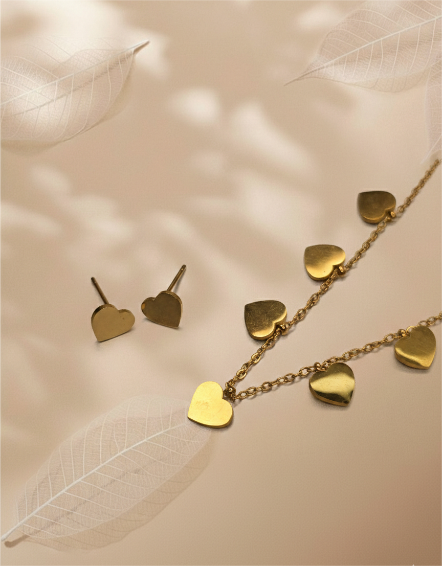 The Golden Hearts Charm Set features a graceful gold-finish chain adorned with delicate heart charms, paired with matching heart stud earrings. Simple yet expressive, this design captures the warmth of love and timeless elegance. Lightweight and easy to style, it’s perfect for everyday wear, special moments, or gifting someone close to your heart.